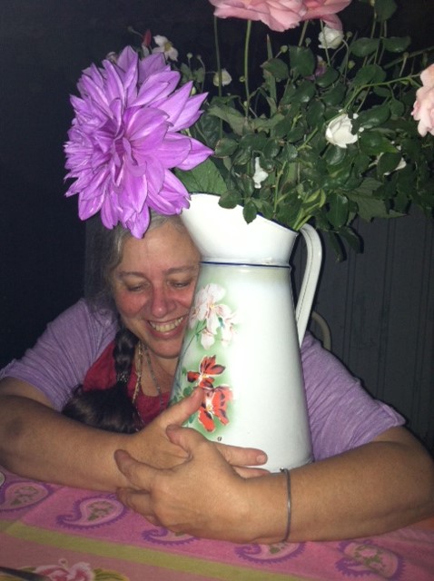 But the days have been warmer and on one of the last of summers evenings, we all headed over to Alison's House for a summer birthday party for yours truly, celebrating my 55th. It's a speed limit kind of thing my friend tells me - the 55th year. And though it was weeks ago, between travels and wedding work and general busyness, in a better late than never fashion, and devil may care, we shall celebrate when we can and how we please, we sat under an outside garden room which had an arbor dripping with grapes ( no joke, you looked up and there were green grapes hanging everywhere) and the walls were various kind of dahlias - in such a room we dined on tamales and fresh corn and greens and later we (I think there were eight of us) ate peach pie by candlelight. And it all felt faintly Dionysian. And I got world's loveliest bouquet in world's loveliest container for a present. Which all made me feel deeply contented and happy. And then Becky snapped a photo of me with a purple dahlia floating above my head. Happy end of summer to us all.